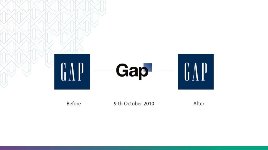 مثال آخر عندما قامت (Gap) بتغيير شعارها كان ردّ فعل جمهورها سلبي لارتباطهم القوي بشعارهم القديم، لذلك اضطرّت Gap إلى استعادة شعارها القديم بعد 6 أيام فقط!