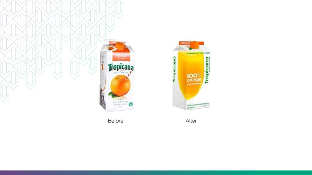 في عام 2009م كانت تروبيكانا Tropicana تُعد من الأفضل مبيعاً على مستوى العالم لعلب عصير البرتقال، والّتي بلغت مبيعاتها 700 مليون دولار في السّنة، فكان لديهم قرار في إعادة صياغة العلامة التّجاريّة لعلبهم مع شركة بيتر أرنيل المتخصّصة في تصميم العبوة الجديدة، وكانت النّتائج: